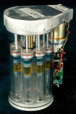 The Fluid Processing Apparatus (FPA) shown in Figure 2 is the fundamental experimental unit of the CGBA payload. It is essentially a “micro-gravity test tube” which allows controlled, sequential on-orbit mixing of 2 or 3 fluids. The fluids are contained inside a glass barrel with an internal diameter of 13.5mm. Up to eight of the FPAs are loaded into a motorized Group Activation Pack (GAP), shown in Figure 3. Control software initiates the mixing of liquids containing different cell culture mediums at specified times once the payload has attained micro-gravity. A second motor initiation, which depresses a plunger in a manner similar to a syringe, combines the cell culture mixture with a fixative reagent, which squelches further biological reaction. The flight samples are then analyzed in comparison with identical samples in ground-based experiments to determine the effects of micro-gravity upon fundamental biological processes. Pharmaceutical and crystallization investigations are common candidates for these types of experiments; a small increase in the efficiency of a reaction can lead to a significant increase in the desired products, and thus to a company's profit margin.