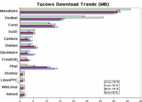 After a slight slip due to a strong Red Hat surge in April, Mandrake bounced back to increase its lead in Linux distribution downloads from Tucows in May. Measured through May 25, Mandrake was first with 40%, followed by Red Hat with 23%. That's a gain of 4% for Mandrake and a drop of 7% for Red Hat. Next was Corel, which dropped 2 to 10%. SuSE gained 2 and reached 5%. Slackware had 3%, FreeBSD had 2 and so did Phat, which continued its drop from a high of 13% in February. The rest were at 1% or less.