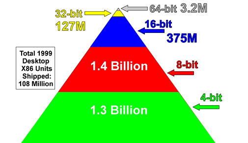 The same is true in terms of software. It is not uncommon, when operating systems are being discussed, for the ``experts'' to casually toss out the ``fact'' that 85% (or whatever number is currently in vogue) of all computers run on Microsoft software. It stands to reason then, that if less than 5% of the microprocessor hardware shipped is going into personal computers, the vast majority of operating system code must not be desktop-type operating systems. In fact, in numerous studies, by far the most pervasive operating systems have been those termed proprietary.