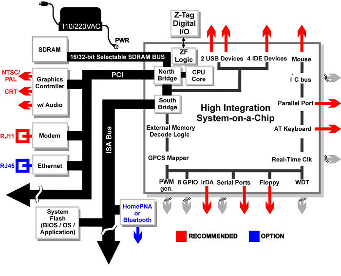 The first is an internet appliance/thin-client design that uses standard buses to interconnect readily available PC peripheral chips to an x86 SOC (see Figure 2). The operating system is Linux with a reduced footprint browser.
