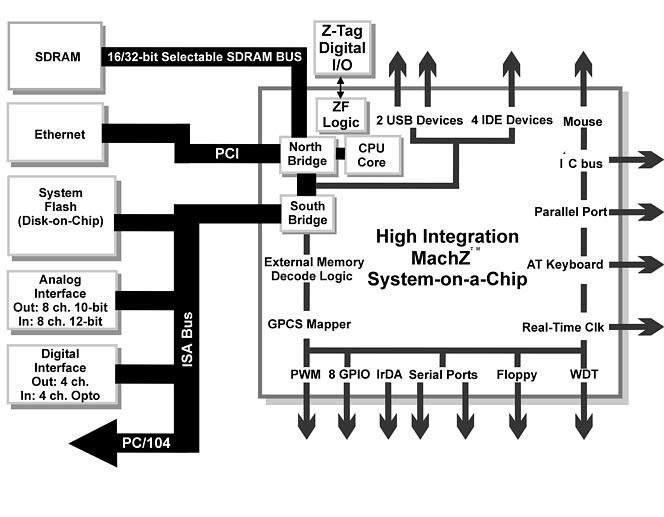 Tri-M designed its latest two PC/104 boards around a single-chip PC and selected the most highly integrated device they could find to allow a substantially reduced component count and cost reduction in board real estate. The high level of integration saved cost in the total bill of materials, reduced assembly costs, increased mean time between failure figures and is expected to reduce costs for warranty and service support. This device was also selected for its power efficiency--even at its top operating speed of 133MHz, it consumes about a half of a watt. Less power consumption means less heat, less engineering to dissipate heat and longer battery operation life. However, the main reason for the selection of the x86 architecture is the hardware and software compatibility. The ready availability of PC hardware, software and device drivers dramatically reduced time-to-market and made the product both backward and forward compatible with the rest of the PC/104 devices on the market. The reduced time to production obtained by using a standard architecture is evident in the time required to design two separate boards. The first design, although a very complex ten-layer CPU board, was completed in six weeks from start to prototype. The second design, using the MachZ PC-on-a-Chip (recently changed to ZFx86), took less than three days for a full six-layer PC/104 design from start to prototype. This reuse of standard hardware architecture and software drivers effectively enables Tri-M to offer its customers customized solutions in record time.