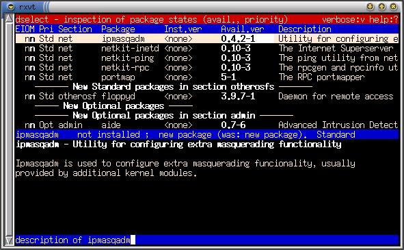 “[S]elect” is where the actual package management happens. First, you'll be presented with a help screen. READ IT! When you finish READING IT, press space to get out of help or “.” to read the keybindings. You can move around the package listings by searching or by using up/down, page-up/page-down, home/end and left/right. The following are some basic, useful keystrokes in dselect: