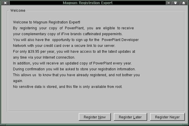 The installer—which must be run as root—starts with the registration screen. Registration is not compulsory unless you also subscribe to their update feature, in which case it just makes sense to register. There is a Never Register button that you can use and live happily ever after (see Figure 1); I have registered and haven't received any spam from them yet.