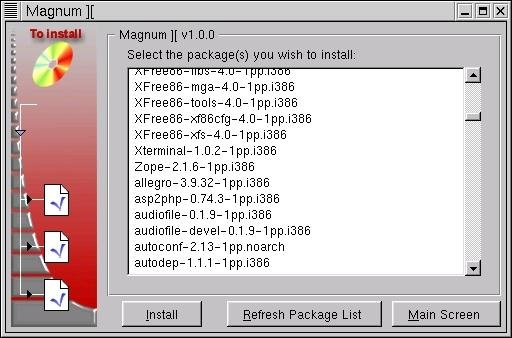 The mostly red PowerPlant box contains four CDs and a manual. The first CD has RPM versions of the included software, the second CD has Debian packages and the third CD has .tar.gz sources. The manual details their installation program, Magnum. Since I use Mandrake, I will include a short description of the RPM installer here.