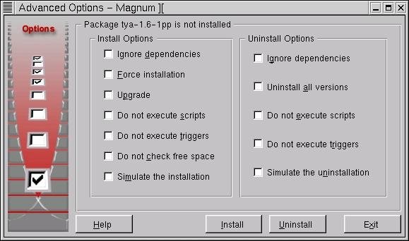 The installer next presents you with a small window (I chose the graphical installation, there is also a text one) with an Install and Uninstall button among others. Choosing Install brings you to the list of provided applications, unless the RPM database says they're already there (see Figure 2). When you choose a package, the installer presents you with the package description and the choice between a standard install and an install using advanced options (see Figure 3). You will get to the advanced screen if anything bad happens during normal installation (see Figure 4). The RPM version of the installer allowed me to upgrade a package if it was already there, force install it and/or skip running the package scripts. If you don't know the RPM command line by heart, you will find all those options described in the on-line help.