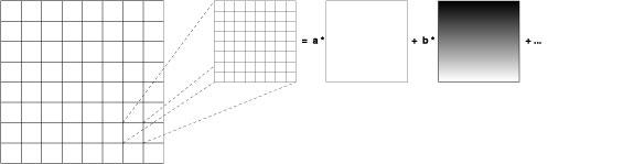 In Figure 2 the image is subdivided into 8x8 pixel blocks. Each of them is approximated by a linear combination of the cosine basis. The approximation coefficients (a and b in the figure) are then quantized and stored in the JPEG file. FIASCO extends this concept in the following ways: