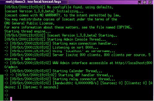 Icecast is very simple to run. Go into the account you want your broadcast server to run as and enter /usr/local/icecast/bin/icecast. This brings you to console mode on the Icecast server. If you type a “?” at the console you see all of the options that are available with Icecast. We would like to note that from the console you can see when someone connects to the site. If you start Icecast with a -b option it pushes the console to the background. Figure 2 is a screen capture of the startup of Icecast.