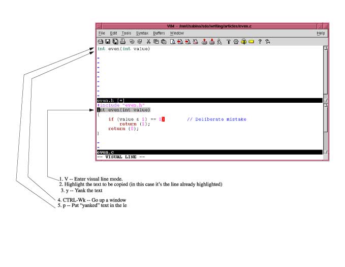 First, bring up both files in the editor. The command :split even.h splits the current window in two. The top-half gets the file even.h, and the bottom even.c (see Figure 2).