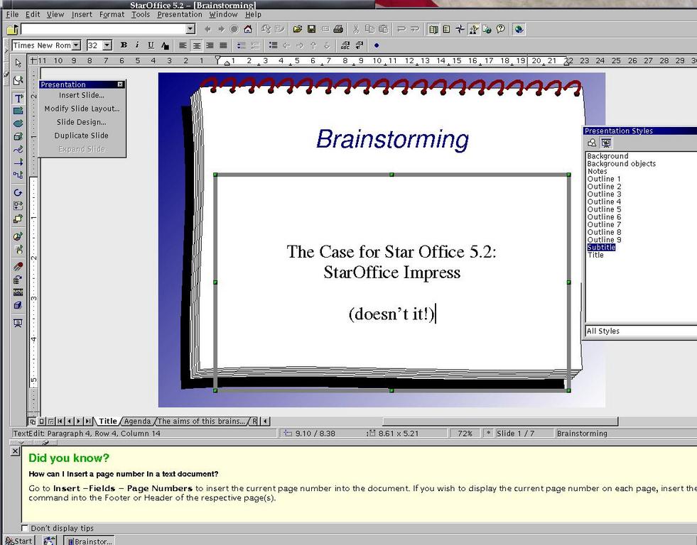 Both of these tools were surprisingly good. I'm no graphic artist but still managed to get a little slide up in less than seven minutes. Actual presentation makers could probably get the whole presentation done in that time. As it was, I attempted to make a few more “slides”, create a slide show, change the order, etc., and view the results with Player. In terms of tools that are designed for productivity, and not for messing about with configuring/de-configuring options, these two applications exemplify the ease of use the developers of other StarOffice applications should be aiming for.
