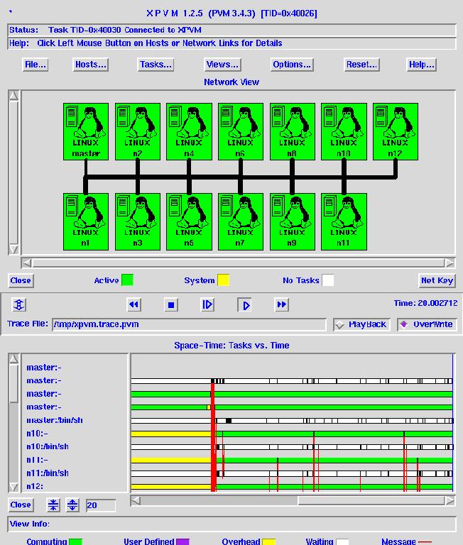 Figure 1. Screen shot of the bWatch program of the ImageLinks Cluster. The red lines indicate communication between nodes and demonstrate that the process is CPU-bound.