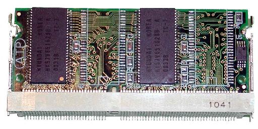 The obvious solution is to not populate the upper 32 bits of memory. Great theory, but not all SODIMM memory cards can be depopulated and still work with the MachZ. When SDRAM chips of 16-bit width are used, some manufacturers wire one half of the memory into the first 32 bits and the other half of the memory into the second 32-bits. This makes for efficient PCB layout, but when a chip is depopulated, it also depopulates the lower 32 bits (the lower 32 bits are the ones the MachZ require). It turned out that the memory from the president's notebook was the right type to depopulate, and so the depopulation theory was proved. The memory pirated from the presidential notebook was made by ATP Electronics, Inc. and used four 128Mb chips, providing 64MB of memory for the MachZ. The same PCB from ATP could be configured using 1, 2 or 4MB chips. Thus, with one PCB layout 8, 16, 32, and 64MB can be assembled.
