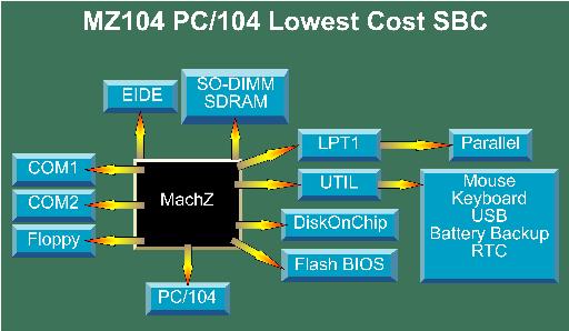 The MZ104 is an expandable embedded PC. You can pull the DiskOnChip out of the socket and run with the 4MB Flash chip and SDRAM. The Flash chip can contain the BIOS and a resident Flash disk (which can be a bootable floppy image). The Flash chip can also contain a flat image of a Linux kernel or a VxWorks image. You get a free runtime license for the Phoenix BIOS and for VxWorks with each MachZ chip.