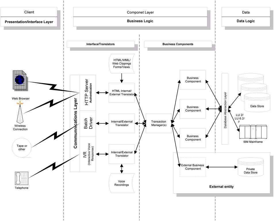 Interfaces and translators enable developers to focus on the business logic without the distractions of how the data is formatted or presented. These translators can use a common stream of data coming from the business component and move it to virtually any front end: Web, IVR, wireless or even print streams.
