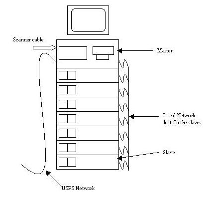 The United States Postal Service has over 900 computer systems, each consisting of eight Linux machines, that are used to convert mail piece images into the destination address text. Seven are dual Pentium Pro 200s called slaves, and one is a single Pentium Pro that is the master. The master is a typical PC with a monitor, keyboard, mouse, floppy, hard disk and a CD-ROM drive. It has two Ethernet cards and one image capture board. (See the Sidebar for complete hardware/software information.) The other seven computers, called slaves, run the optical character recognition (OCR) algorithms. They only have a hard disk and an Ethernet card. This recognition system is shown in Figure 1, which also shows the network setup.