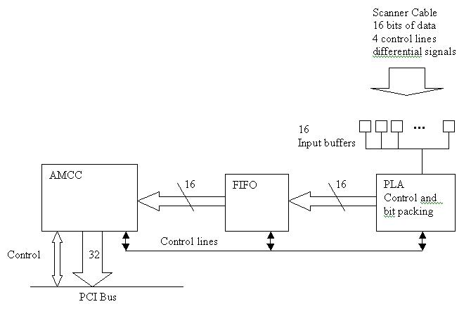 The image capture board uses an AMCC 5933 chip for the PCI logic, as shown in Figure 2. To that we added a FIFO and some PLAs. The PLAs pack the binary pixels into bytes, and they order both the grayscale and the binary bytes into longs. This process is diagrammed in Figure 3.
