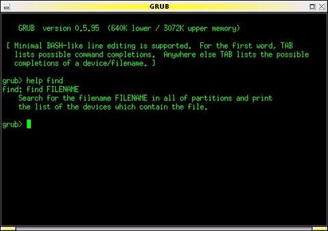 The help command will display a list of the 40 or so commands available in GRUB. Typing the name a particular command after help will produce on-line help for that particular command. So grub> help kernel will tell you all about using the kernel command.