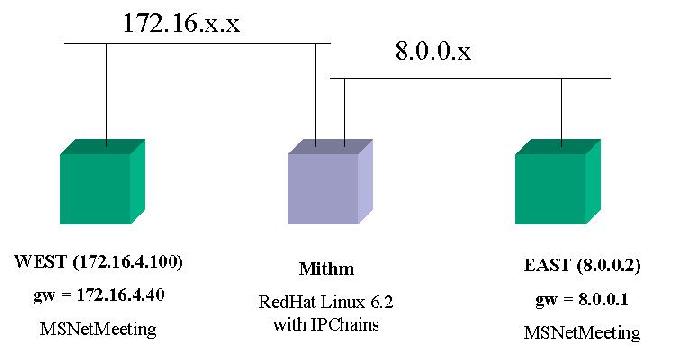Having installed the Linux machine in the middle of the network, we delve into the TPC/IP stack so that we can create the adaption functions in a modular, nonblocking, input/output, real-time, client/server fashion. In effect, we stop the packet flow by setting up rules in IP chains and using the libpcap interface to bring the stopped packets up to user space for analysis and, ultimately, compression/decompression. Having physically reproduced the architecture of Figure 2, it is a trivial matter to establish an uninterrupted teleconference session whose packets are forced through your Linux machine. IP forwarding must be enabled for this to function, particularly since we are going to stop the flow of packets with the use of IP chains. To verify that IP forwarding is indeed enabled, type: