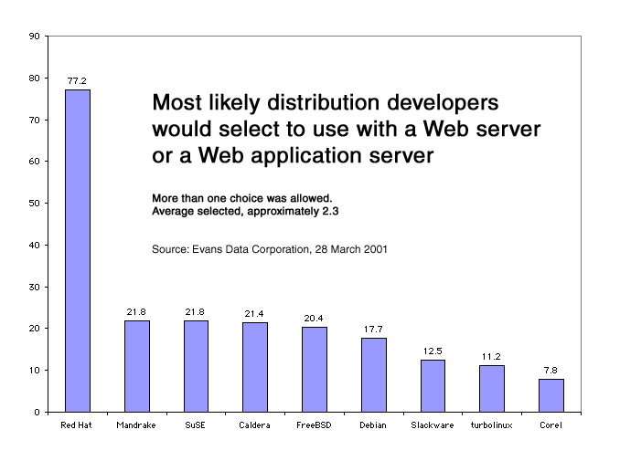Recently Evans Data Corporation of Santa Cruz, California asked 300 Linux developers which distributions they would select for a web server or a web application server. The obvious answer was Red Hat. Coming in second were SuSE and Mandrake, each with 21.8%. As the chart shows, though, the question for developers really is “Who would you select in addition to Red Hat?” The average number of additional choices was 1.3 (for a total of 2.3 choices). Caldera, Debian and FreeBSD weren't far behind SuSE and Mandrake.