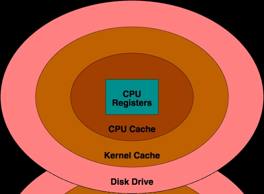 To understand hardware performance issues, it is important to understand what is happening inside the computer. For simplicity, a computer can be thought of as a central processing unit (CPU) surrounded by storage. On the same chip with the CPU are several CPU registers, which store intermediate results and various pointers and counters. Surrounding this is the CPU cache, which holds the most recently accessed information. Beyond the CPU cache is a large amount of random-access main memory (RAM), which holds executing programs and data. Beyond this main memory are disk drives, which store even larger amounts of information. Disk drives are the only permanent storage area, so anything to be kept when the computer is turned off must be placed there (see Table 1). Figure 1 shows the storage areas surrounding the CPU.