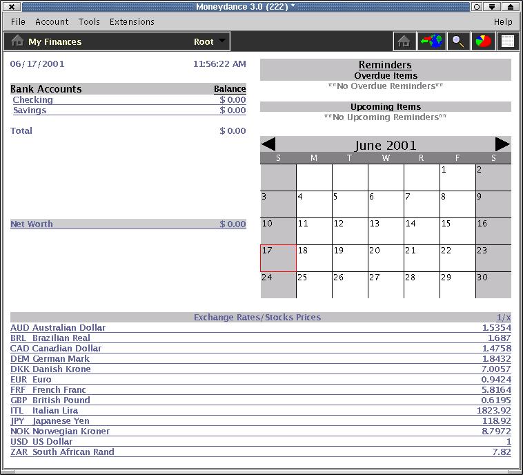 If you're interested in exchange rates, updated currency exchange rates are a mouse-click away on the top icon bar. You can also set up a portfolio of stocks, and if you're so inclined, use the Python plugin (covered later) to grab the latest stock prices from the Internet and drop the values into your tracking history.