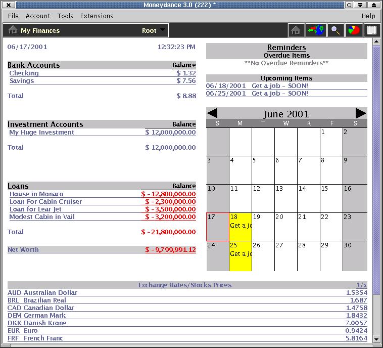 A couple of times the program seemed to hang on me, but ps would show the process still running. This may have been the combination of running X, KDE2 and GIMP for the screenshots, plus the fact that Moneydance was a bit much for the P166/80MB machine I was working with. As I always recommend, save often and make backups so you don't lose your critical data. (The newest version does automated backups for you). As I noticed with AppGen, Java-based apps are a little bit slow on a machine of this class but usable. If you have a more contemporary machine you should be fine. Also font rendering on some of the screens was a little fuzzy but still readable.