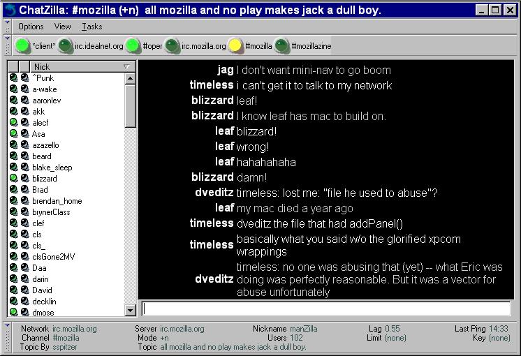 You can build all sorts of applications on top of the Mozilla applications programming framework. The Mozilla and Netscape 6 browser suites are examples of applications that have been built on top of the Mozilla applications programming framework. So is the ChatZilla chat client -- please see Figure 2.