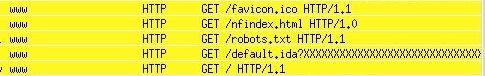 This isn't the only way to make the list of packets a little easier to follow. Have another look at the main Ethereal window. See that Filter button at the bottom left hand corner? You can enter the field you wish to filter right there. Since I wanted to watch web requests coming across the interface, I entered http.request. This results in a display that shows nothing but my http requests, which served to highlight a Code Red worm infiltration attempt. Incidentally, that's the line that runs "GET /default.ida?XXXXXXXXXXXXX".