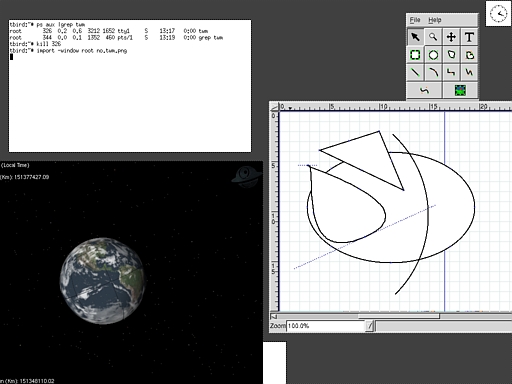 Deliberately killing the twm reveals what happens if you lose your window manager. Our Dia, OpenUniverse and xterm windows still display, but there is no means to move them.