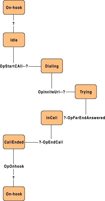 At this point, the call is in progress until one of the users hangs up, thus generating an On-hook event, which the OpTerminateCall operator processes. This operator sends an SIP BYE message to the far end, which ends the call and takes the UA back to the Idle state where we began. Having looked at a complete call flow, let's shift our attention to the code that makes these operators tick.