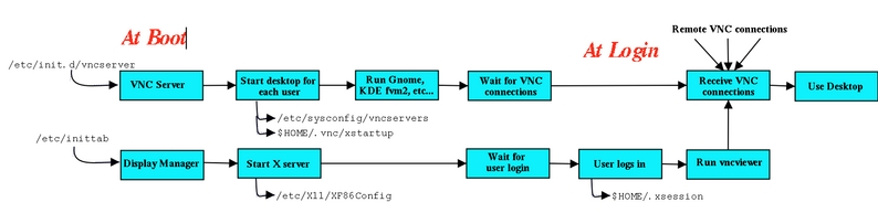 When the server boots, it will run the VNC server for each user in the /etc/sysconfig/vncservers file. As it starts up, the VNC server reads the .xsession file in your home directory and will use it to run your preferred window manager. Then the VNC server will simply sit in RAM, waiting for a connection (either a local connection or one from over the network).