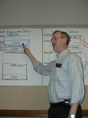 We compiled a kernel for the target, which was a task straight out of regular Linux, except that we turned the final image into S records and transferred them via TFTP to the target, instead of doing a LILO install. The image included a boot loader, but we didn't get to the process of putting anything except the basics into Flash. This class is all in NFS-land. We booted the target and logged in. My lab partner and I had "hello world'' running on the target at 3:27 P.M. on day one.