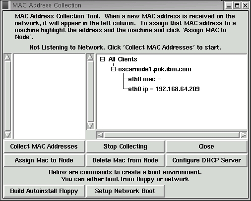 From the Setup Networking panel, MAC addresses are collected for each client in the cluster. If the node is capable of true network (PXE) boot, you simply associate a MAC address with a client, and you're ready to power up the node. If the node is not PXE-enabled, you can write a SystemImager boot diskette from the Build Autoinstall Floppy button. Once the MAC addresses are collected, it's time to press the button to Configure the DHCP Server and boot all the nodes to initiate Linux installation.