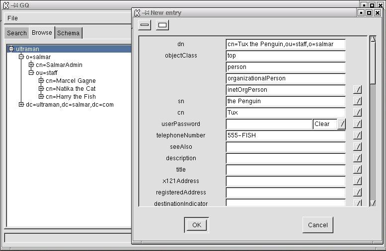 Suddenly, we have an LDAP database populated with all the data from our corporate address books (or, for the more popular among you, personal address books). This is a great approach for that initial load, but what do you do when you want to casually add data to this directory? This constant creation of LDIF files can get a little tedious. If you check your Linux distribution CD, you might just find a little Gtk-based package called GQ, a rather innocuous name for a wonderful tool that provides an LDAP directory browser, schema browser and import/export utility. Best of all, it lets you add, delete or modify single entries in your LDAP directory using a nice, friendly graphical interface. You can also pick up the latest version of GQ from the fine people at Biot.com. Their URL is http://biot.com/gq.