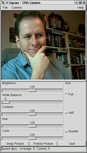 You were waiting for something else, non? There is no make install for this one, mes amis. You can copy the final binary to /usr/local/bin manually, or wherever you want to save the executable. You also can execute the program directly from the build directory, if you wish, by typing ./gqcam &. You may find, as I did, that the program looks to /dev/video by default. With the USB device, my webcam was actually at /dev/video0 while /dev/video was a directory. To get around this, I used the -v flag: