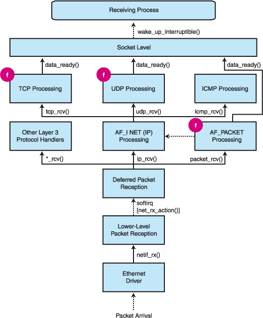 The PF_PACKET receive function finally completes its job by invoking the data_ready() function on the receiving socket, just like the TCP and UDP processing functions did. At this point the application sleeping on a recv() or recvfrom() system call is awakened and packet reception is complete.