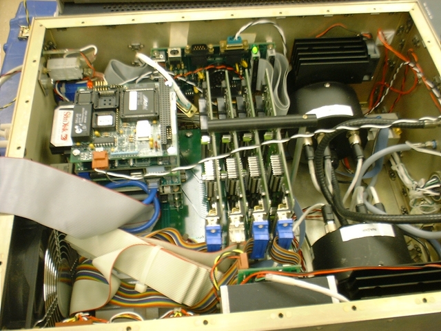 The inside of the instrument. As you can see, it is dominated by the interface cards for the spectrometers (middle) and the instruments themselves on the right. The PC/104 stack is shown in the upper left.