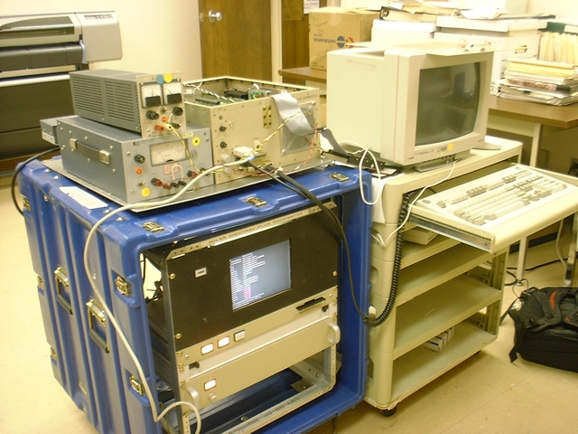 The on-the-runway setup. The SSFR box is connected to an ATM-style monitor and pull-out keyboard to do calibration and data analysis in the field.