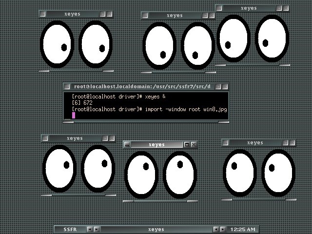 Running multiple copies of xeyes is an integral part of the operation of the Solar Spectral Flux Radiometer. Notice that we are running the Blackbox window manager on the kdrive X server, which allows the flexibility of running any X application yet consumes minimal resources.