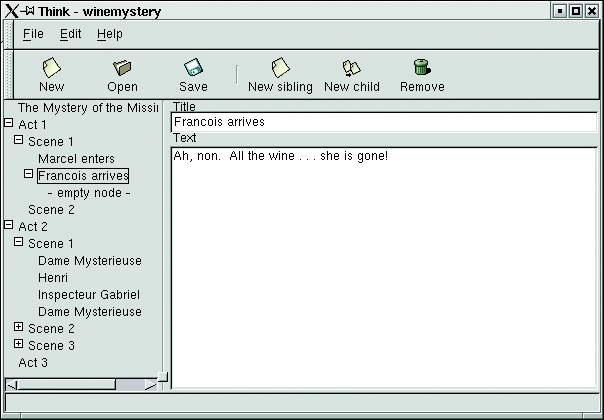 Laying out a scene and creating the perfect dramatic presentation requires some finesse with outlines and organizing your thoughts. That is exactly what Peter Teichman was, er, thinking about when he wrote Think, a Gtk/GNOME application that lets you create outlines based on a hierarchical structure. The result is then saved as an XML document. For a peek at Peter's Think, go to primates.ximian.com/~peter/think and pick up the latest source. After extracting the code, you can then build it using the classic ./configure three-step: