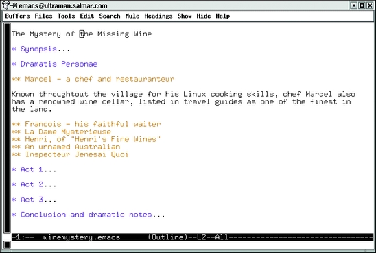Of course, if you are running Emacs in X or graphical mode, you can just click on the Show and Hide menu items in the menubar. When a level is collapsed, its first line or title will appear with the trailing ellipses (. . .) and the information that follows it will be hidden. If you look at Figure 3, you'll see me spinning the “Mystery of the Missing Wine” using Emacs' outline mode.