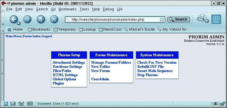 The next item on the menu is called Phorum. Phorum is free, open-source software and is distributed with a simple, Apache-like license. It requires a PHP-enabled, Apache server and one of the supported database types. This database can be PostgreSQL, MySQL, Sybase and others. Phorum is designed to be pretty database-independent, and the install will do an auto-detect for currently running database servers.