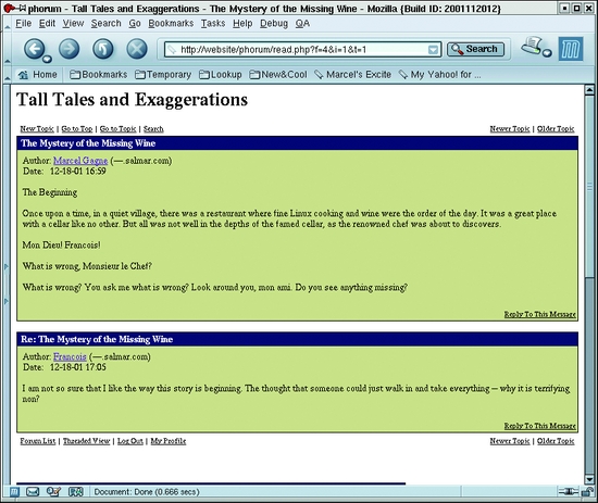 Now users can create their own profiles, read, post and reply to other posts. Whether they actually require a login profile will depend on the requirements you set up when you created the discussion areas through the Phorum admin screen. Figure 6 shows a Phorum discussion in process.