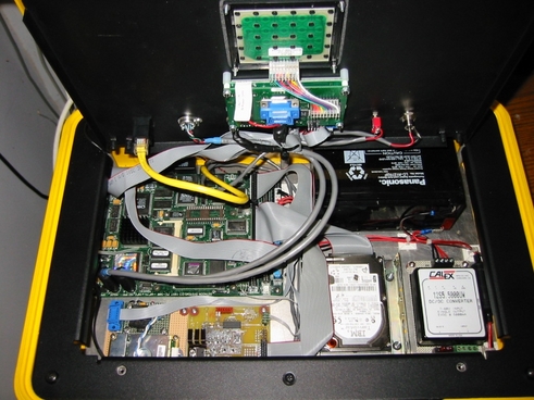 Figure 2. With the front panel hinged open, the innards are revealed. The Octagon PC-500 running Debian GNU/Linux is on the upper left; GPS and power control are on lower left.