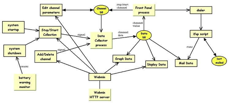 We thus chose Perl for our data collection and configuration programs. Part of this choice was pragmatic: a number of the harder parts of the job was already done for us by CPAN modules or extensible Perl programs, including Berkeley DB interface (BerkeleyDB), event kernel with timers and I/O triggering (Event), web server and system configuration (Webmin), serial port control (Device::SerialPort), SMTP mail transmission (Net::SMTP) and graph generation (Chart::Plot and GD).