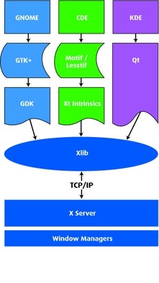 The two most popular open-source toolkits that layer on top of Xlib are Qt and GTK+, upon which KDE and GNOME are respectively built. Motif is another popular toolkit (not open source, but there is an open-source clone called Lesstif). Figure 1 shows a diagram of these (and more) and their relationship with one another. The farther down on the diagram, the lower the level of API it is. I prefer KDE/Qt for many reasons, but mostly because it's focused on a good user interface and a clean and well-designed API.