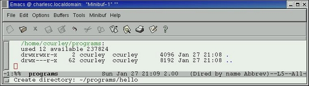 Figure 1. Using Emacs' dired mode to create a directory for the program—we've shrunk the window down to save space in the magazine, but the essentials are there.