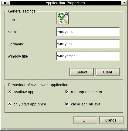 If you have an application already running (from the previous examples), you simply can click on the Select button. Your mouse pointer will change to a set of crosshairs. Move the crosshairs over to your running application, click and voilà!, your application is docked. Optionally, you simply can type in the information yourself. Have a look at Figure 5 for a well-stocked Kappdock.