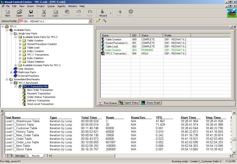 For simplicity, I chose the TPC benchmark as my testing methodology. It's widely recognized as a reliable OLTP workload benchmark, it has both on-line and deferred transactions, it's non-uniform in nature and it applies to numerous databases, including Oracle and DB2. Plus the TPC can be configured to stress all aspects of the hardware: CPU, memory, bus and disk. And to be totally honest, I'm a DBA, and Quest has a wonderful tool called Benchmark Factory that makes defining, running and measuring TPC tests as simple as sending e-mail. The screen snapshot below shows Benchmark Factory's complete interface. With it you can create a TPC benchmark project, define some parameters such as database size and number of concurrent users, copy the tests you want to measure to the run queue, run the tests in the queue and observe the results. No work at all, really.