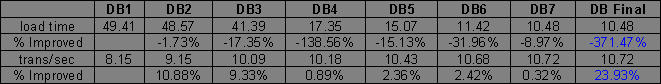 That's another 9% improvement on the load but almost nothing for the TPS. It appears we've gotten all there is from the low-hanging fruits. We got improvements of 342% for the load time and 24% for the TPS; not bad for requiring absolutely no extensive or detailed performance monitoring. The results are summarized below.