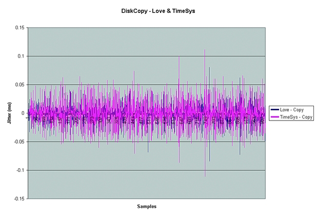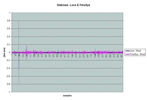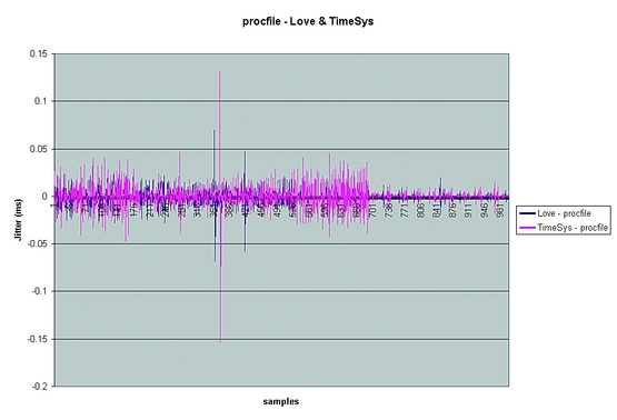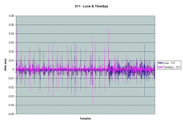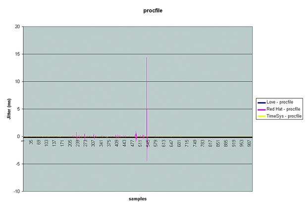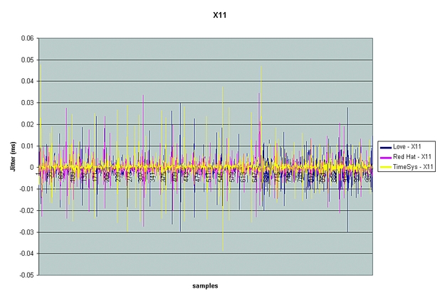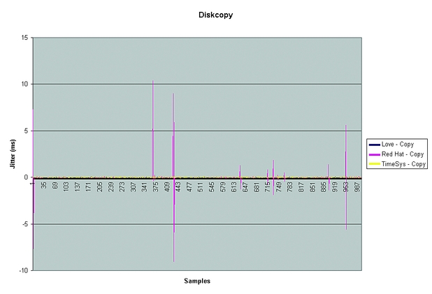 Since the Red Hat kernel is clearly much less responsive than the Love or TimeSys kernels, we separately graph just the Love and TimeSys kernel results. These are depicted in Figures 7-11.